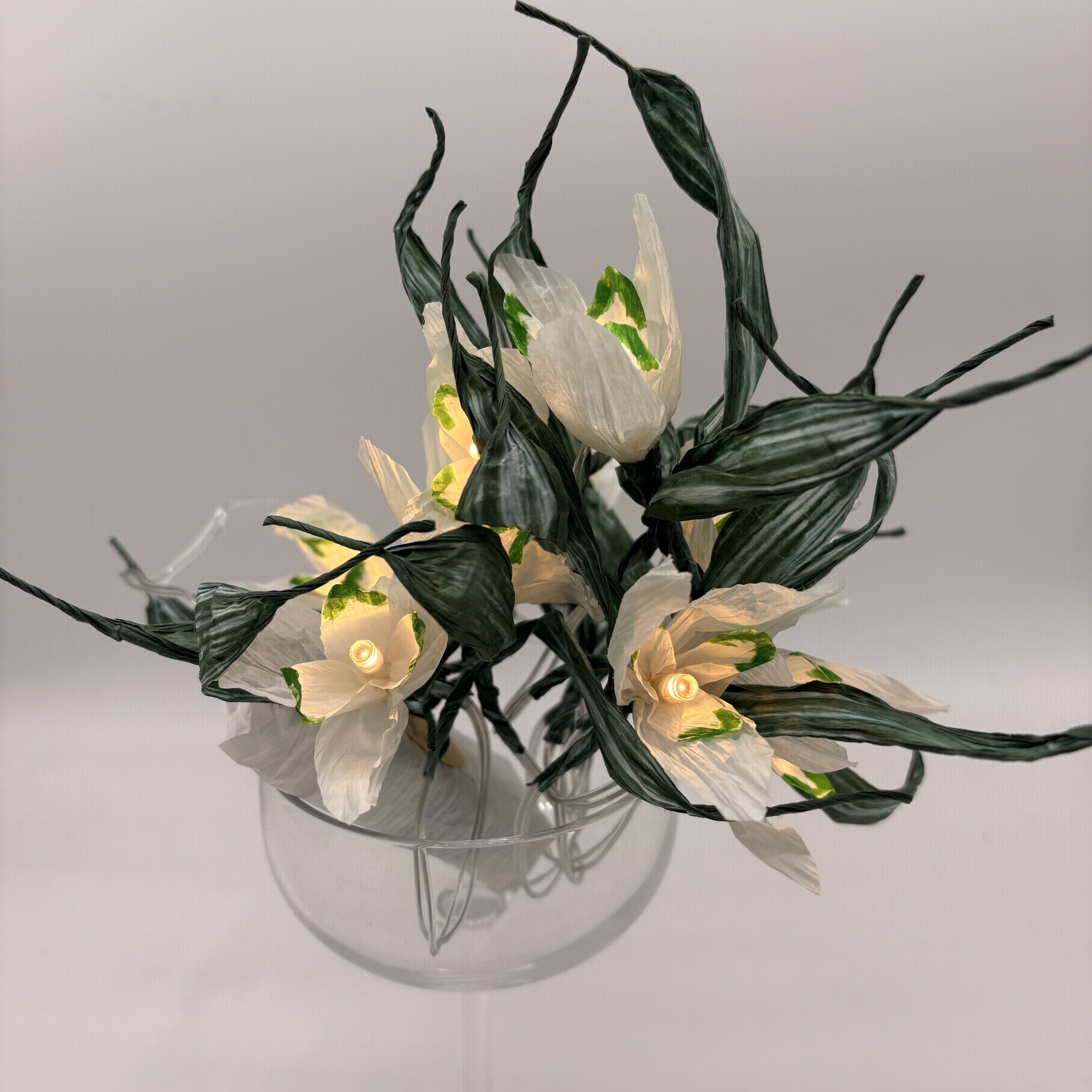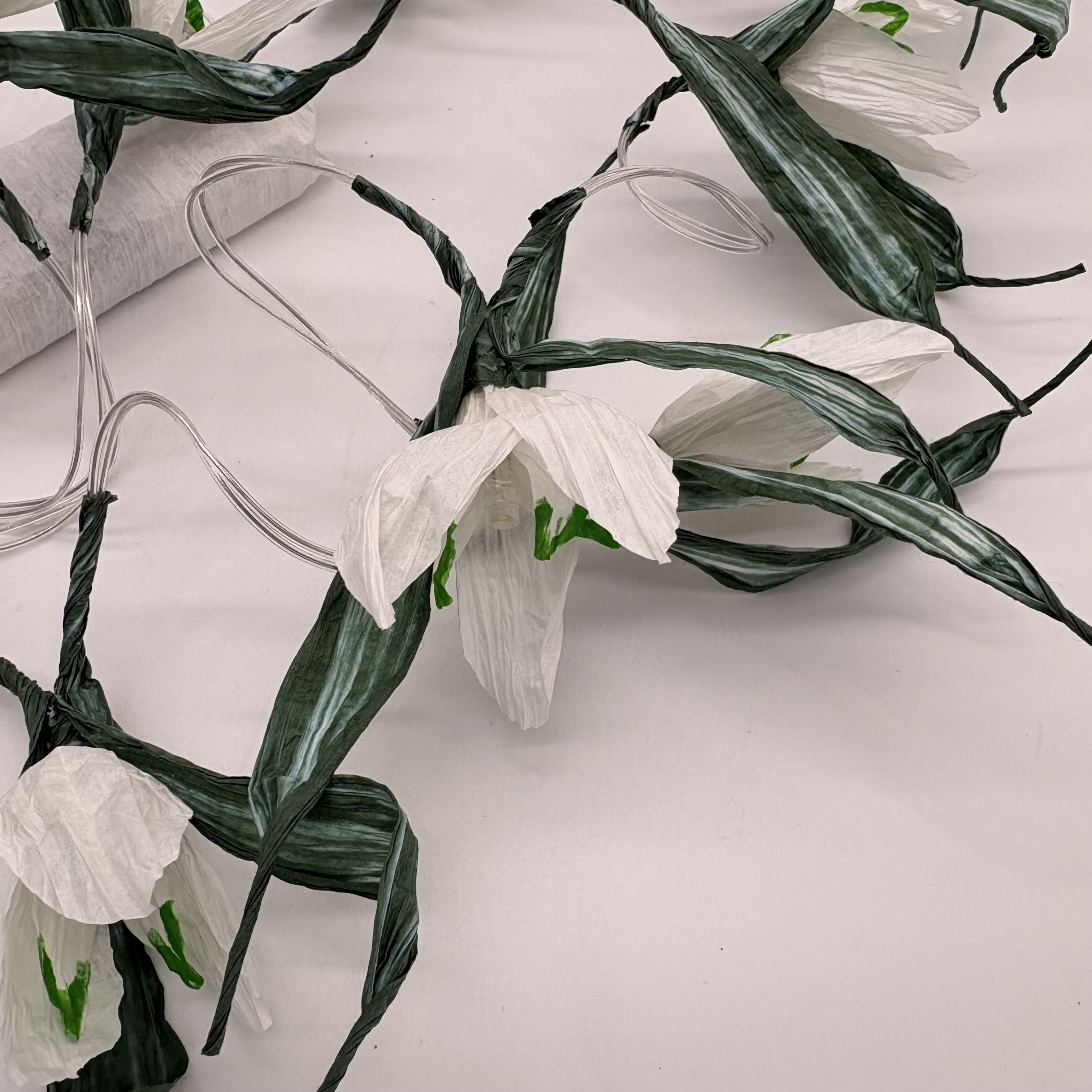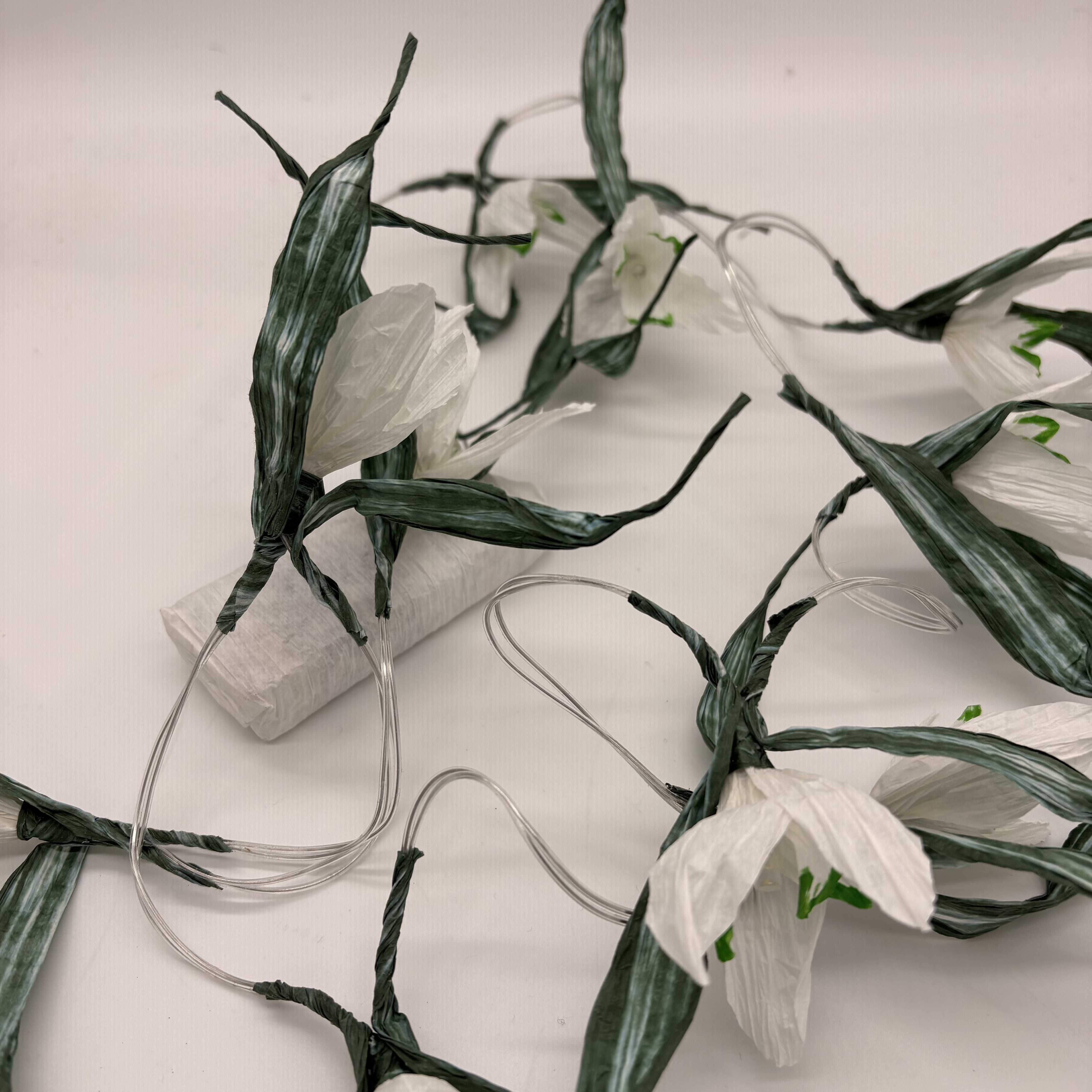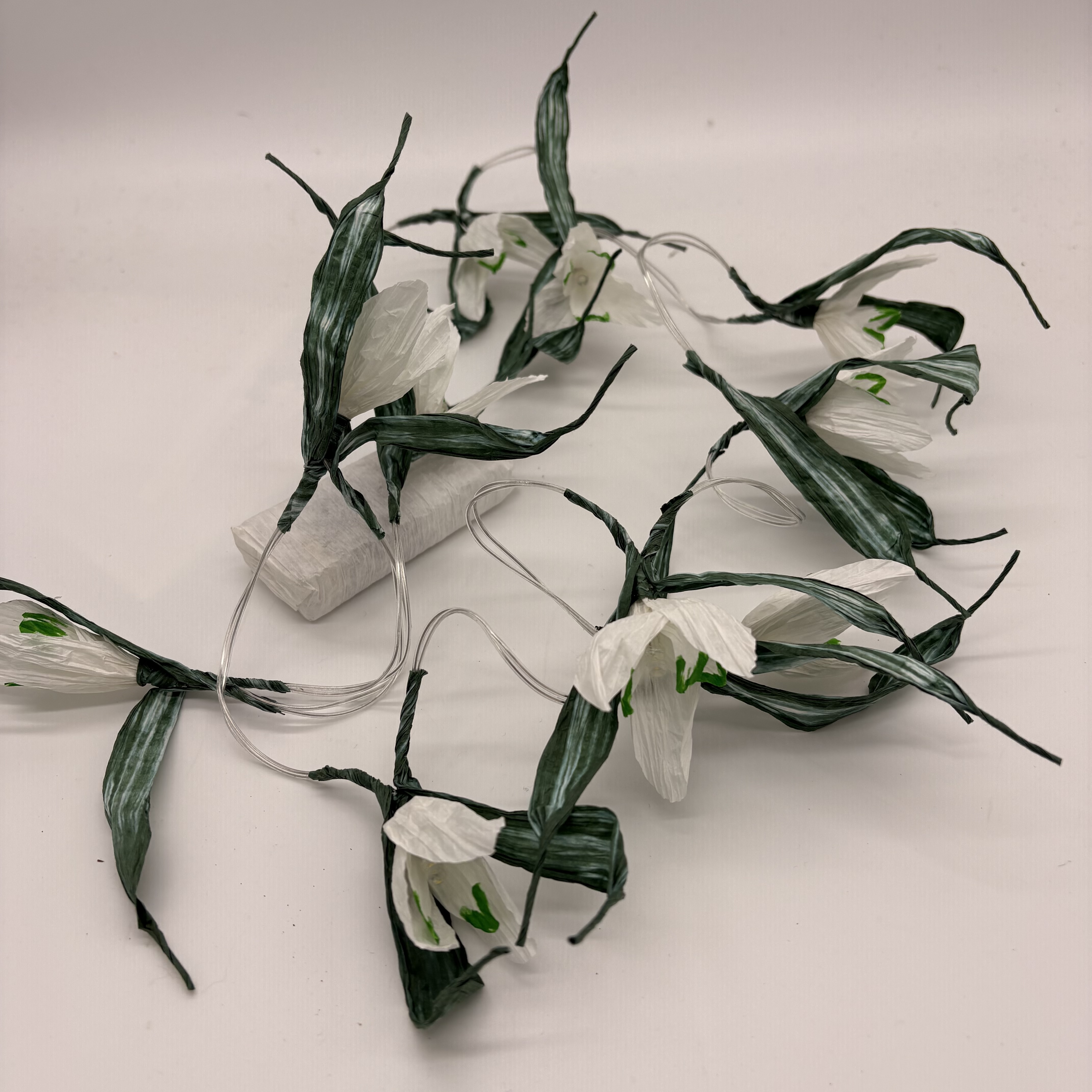 Die Lichterkette aus finnischem Papiergarn besteht aus 10 LED-Lampen, die jeweils mit den einzelnen Blüten verziert sind. Die Länge beträgt ca. 150 cm. Das Batteriefach ist mit Papiergarn verkleidet.